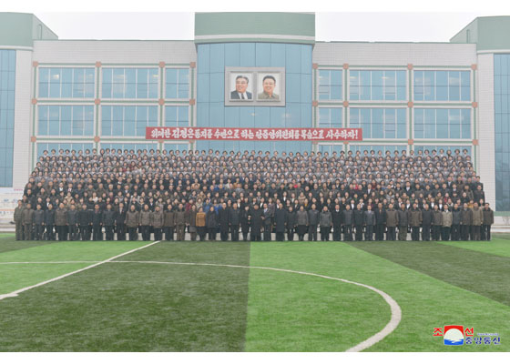 视察结束后,金正恩与学校职工一起合影留念。