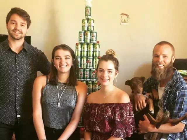 圣诞节的时候,她还发了和一些朋友在一棵小树前的合影,小树是用空VB啤酒罐子叠出来的。