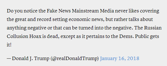 这些引语有助于理解为什么特朗普无法在经济成就上取得他渴望的认同。总统说得基本都对,他当总统以来经济在复苏。可别忘了,他反复提的股市,和大多数美国人没有半毛钱关系;特朗普政策同这些积极信号有没有关系也说不清楚。