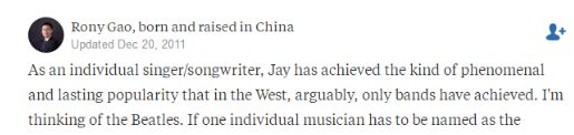 作为独立歌手和创作人,周杰伦的流行程度非凡而持久。在西方只有乐队的影响力能与其媲美。我只能想到披头士了。