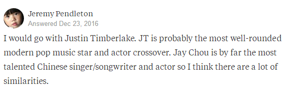 我会选贾斯汀·汀布莱克。他可能是最全能的现代流行乐歌手和跨界演员了。而周杰伦是中国目前最有天赋的音乐人、创作人和演员,所以我认为二者有很多共同点。