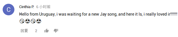来自乌拉圭的Hello!我一直在等周杰伦出新歌,终于来了!我真的超喜欢他的歌!