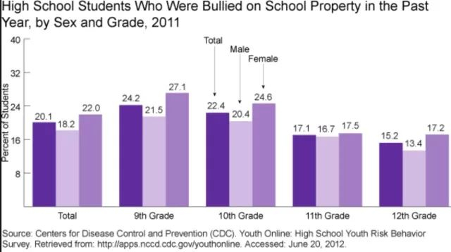 据统计,美国大约有四分之一的学龄小孩长期受到校园霸凌的侵害,30%的孩子牵扯其中,他们有可能是受害者,还有可能是加害者。校园霸凌最高发的时段是五年级到十年级,男孩子比较容易在小学期间受到霸凌,女孩子则是初中高中时期。在某些小地方,因为学校较少,接触的同学也是同一批人,有些受害者可能会从小学开始遭受霸凌一直到高中。