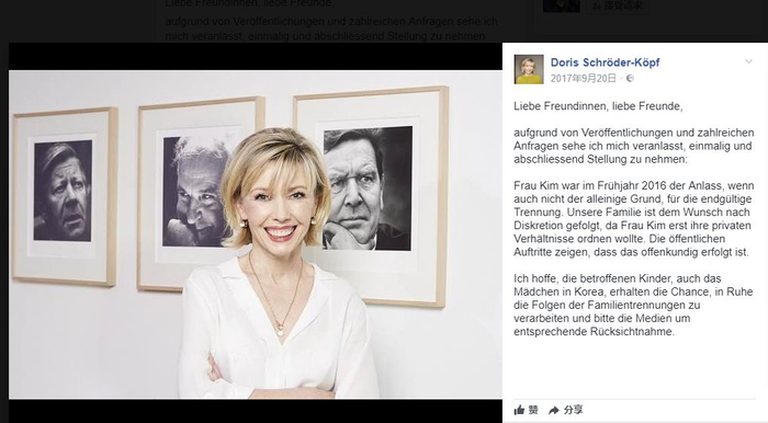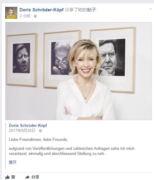 不过,这厢施罗德与未婚妻高调秀恩爱,那边前妻多丽丝(Doris Schröder-Köpf)坐不住了。恰如多家媒体所期待的那样,新闻刚发出没多久,这位金发女记者便在Facebook上重新分享了一遍自己于2017年9月20日发出的对外公告。