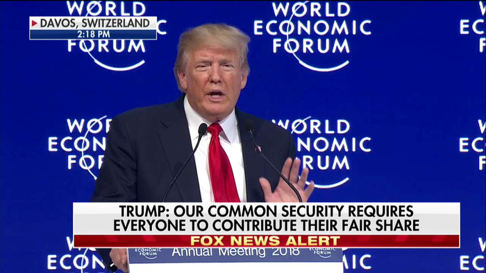 当地时间1月26日,美国总统特朗普在达沃斯世界经济论坛发表演讲。讲话中,特朗普解释称,“美国优先(America First)”不等于“美国唯一(America Alone)”。