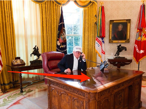这张引起争议的照片来自白宫方面公开的材料。特朗普戴着一顶标有自己slogan MAGA的白色帽子坐在椅子上接听一个电话,上身微微向前倾斜,而他面前的办公桌几乎是空的,实木桌面光溜溜到反射出了阳光的光泽。