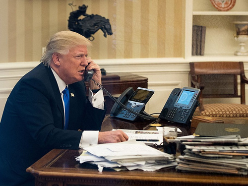 公平地来说,特朗普的办公桌并不总是那么“光洁”的。在2017年1月,特朗普与澳大利亚总理特恩布尔通电话时,他被拍到的照片中,办公桌上还是堆放着大量的文件的。
