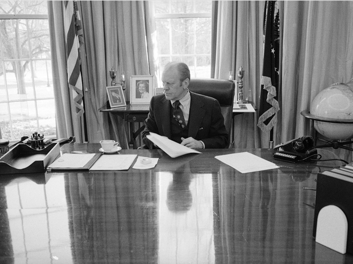 尽管这张照片拍摄于福特总统准备腾出白宫的阶段,但他的桌子上仍然放着一些纸质文件,还有杯子和碟子。