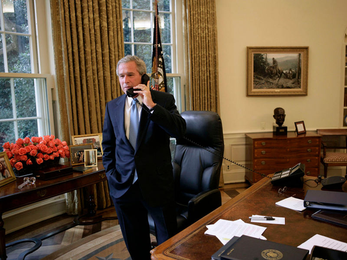 小布什的桌旁也摆放着家人的照片以及鲜花。(摄于2004)