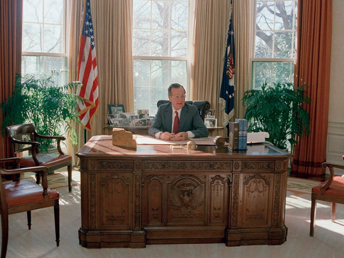 老布什的办公桌看起来整洁一些,不过还至少摆放了一些书籍。他在自己身后的桌子上放了一些个人照片。(摄于1989)