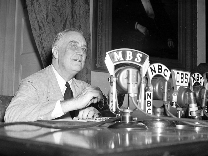 富兰克林·罗斯福的办公桌上摆满了各家媒体的话筒,显然,他正准备发布一次讲话。