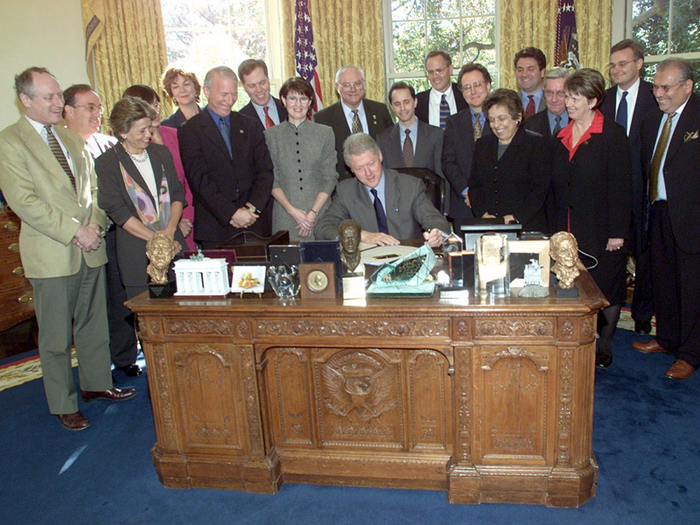 比尔·克林顿的办公桌上堆满了照片、半身像、模型…(摄于2000)