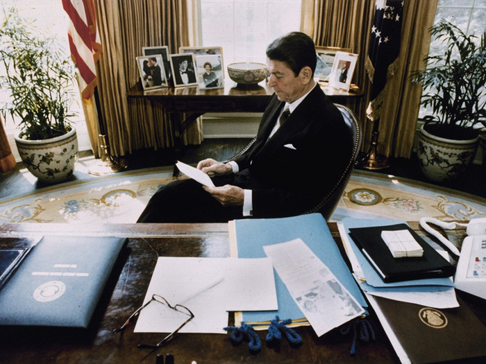 里根总统的桌面上堆放了一些文件,自己及妻子的照片同样也放在身后的桌子上。(摄于1981年)