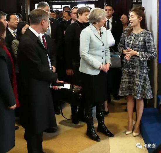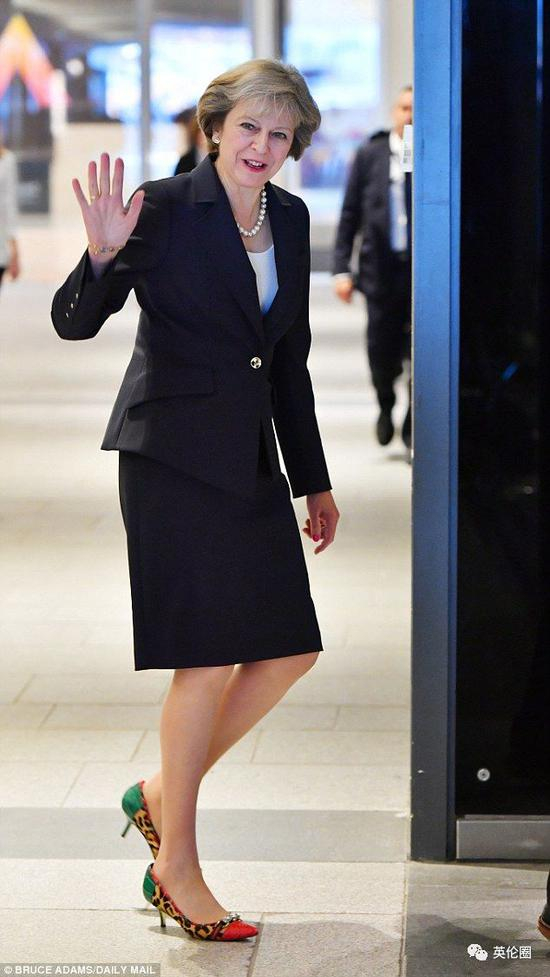 访华第三天(2月2日),到上海参加中英商业论坛(China-UK Business Forum)的梅姨,终于换上了她最具代表性的豹纹小鞋!