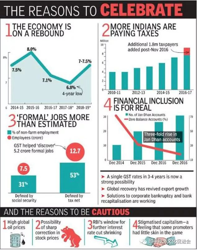 图表显示,印度经济令人欣喜:1。印度经济正在复苏;2。印度纳税人正在大幅增加;3.GST税改促进了就业;4。印度经济的包容性。也需担忧:1。全球油价的增长;2。股票价格大幅回调的可能性;3。印度央行进一步降息;4。资本主义的问题——一些发起人与公司的业绩并无太大关联。