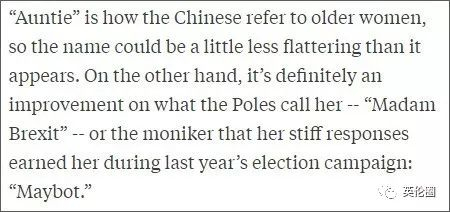 “姨”是中国人对年长女性的称呼,所以这个词并没有表面上看起来那么亲热谄媚。但另一方面,这显然比波兰人称呼她的“脱欧女士(Madam Brexit)”和去年大选中得名的“机器梅(Maybot)”要好听得多。