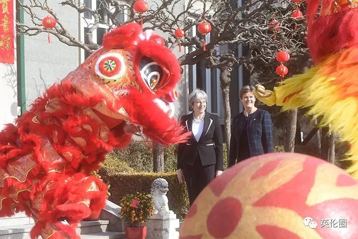 在英国驻华大使馆出席了文化招待会,除了观看舞狮表演之外,还亲手给狮子“点睛”▼