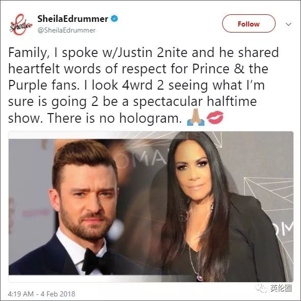 而曾经在王子的巡演中多次担任鼓手的Sheila E。,干脆发推写道:“王子告诉过我,别让任何人播放他的全息影像。如果这事(王子全息影像助阵贾斯汀中场秀)真的发生,那真是不大好!”