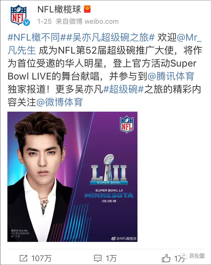 早在1月25日,美国国家美式足球联盟(National Football League,简称NFL)就通过官方微博宣布了邀请吴亦凡成为NFL第52届超级碗的推广大使。看看这条微博的转发量,也是惊人▼