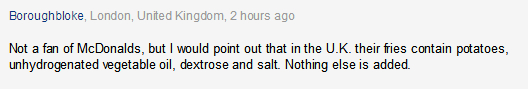 不是麦当劳的粉丝,但我要指出的是,在英国他们的薯条中含有土豆、未加氢的植物油、葡萄糖和盐。其他什么也没有。