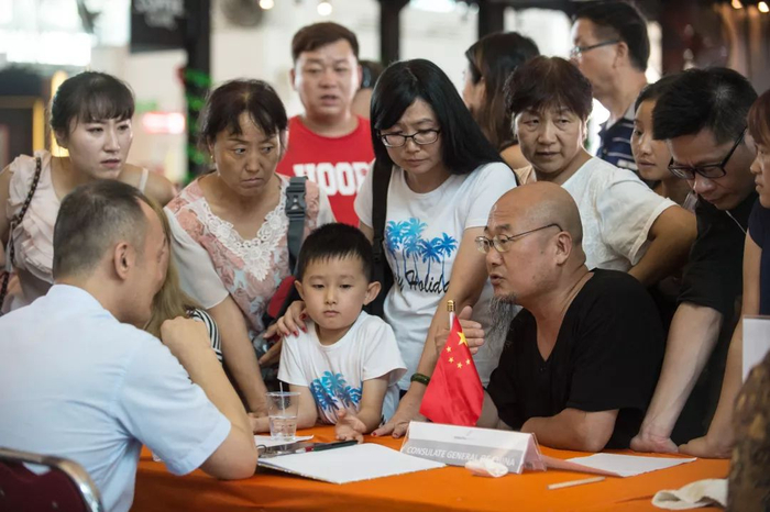 去年11月30日,在巴厘岛伍拉莱国际机场,中国游客向中国驻登巴萨总领馆工作人员咨询情况。新华社记者杜宇摄