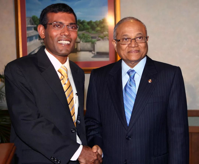 2008年,刚当选马尔代夫新任总统的纳希德(左)与时任总统加尧姆合影。新华社记者陈占杰摄