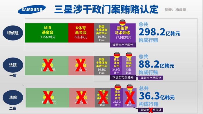 但半年前的一审判决,法官仅认定其中的88.2亿韩元构成行贿,金额分别流入崔顺实幕后操控的韩国冬季体育英才中心、崔氏母女共同成立的核心体育公司(Core Sports)的德国帐户及三星电子的德国帐户。