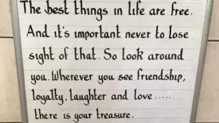 后来陆续有一些别的站也开始效仿,整个伦敦地铁都在一点点变得温暖起来。人们每天早晨走进地铁站,看到这些温馨的话语,调整心情迎接美好的一天。“生活中最好的东西都是免费的,请不要忽视它们。环顾四周,无论你看到的是友谊、忠诚、微笑还是爱……,它们都是你的财富。”