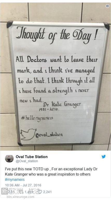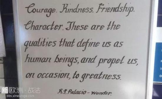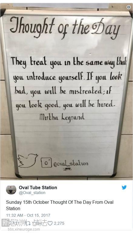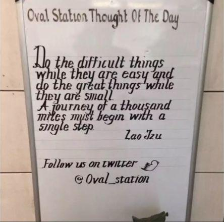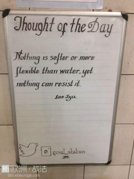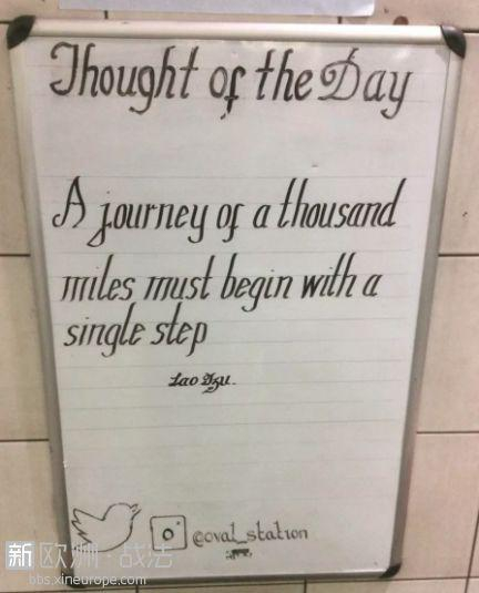 在伦敦坐过地铁的人也许会注意到,许多地铁站里都会有一块白板,上面手写着一些句子。有时候是富含哲理的名人名言“当爱的力量超过了对力量的爱,世界就会和平。”