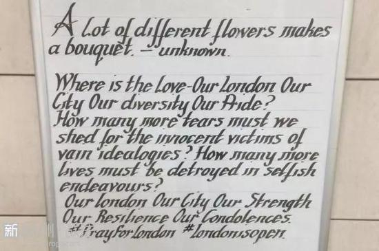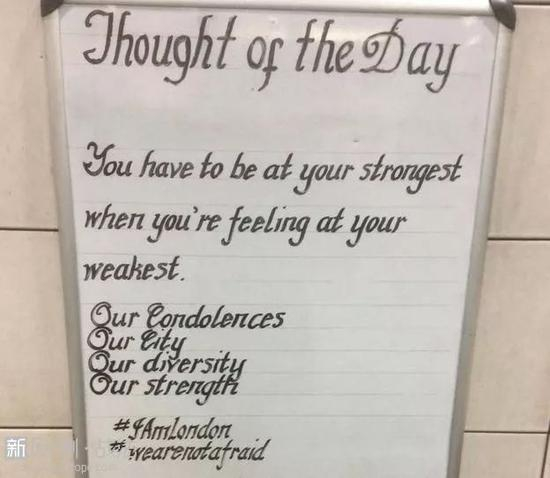 当伦敦遭遇恐怖袭击的时候,工作人员就会在白板上写上安慰和鼓励的话语,为人们抚平伤痛。“当你感觉最软弱的时候你必须变得最坚强。”