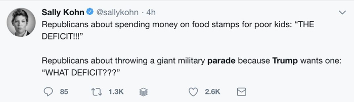 每次一说要救济贫困的小孩们,给他们发粮票,共和党就嚷嚷政府赤字。结果现在特朗普想搞个阅兵,你们的赤字怎么不见了?政府又有钱了?