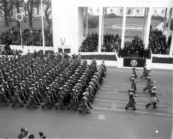 美国军人从白宫前齐整地走过,接受特朗普总统的检阅。