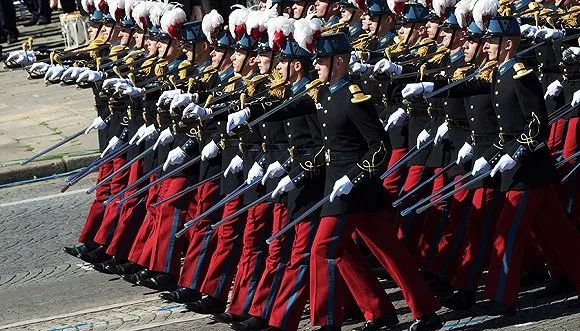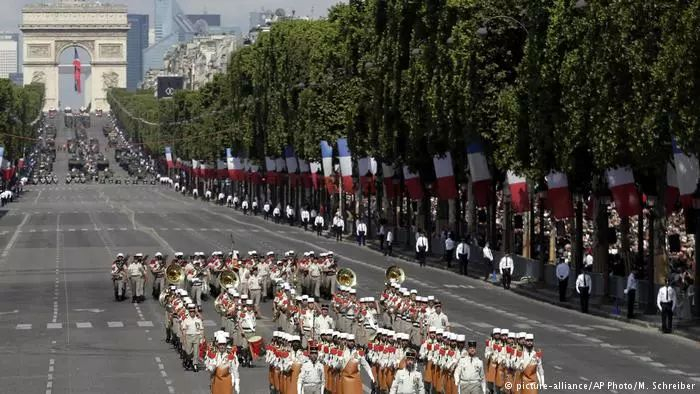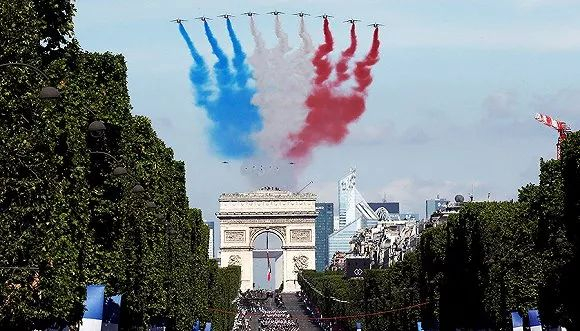 当天的阅兵式中,数列坦克缓缓驶过香榭丽舍大道。紧接着,60多架飞机拖着蓝、白、红三色彩烟飞过城市上空。
