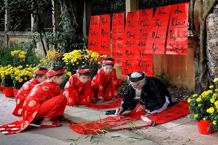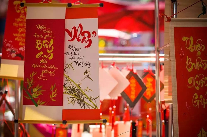 越南人过春节也有贴春联习惯。以前春联用汉字书写,文字拼音化以后,现在大部分春联改用拼音文字,每个拼音字是一个方块,自成风格。