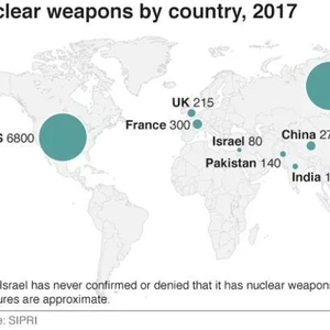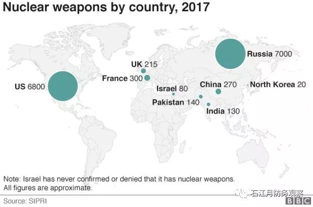 根据斯德哥尔摩国际和平研究所数据,美国和俄罗斯各拥有约7000枚核弹头。其他核武国家拥有核弹的数量分别为:法国约300枚,英国约215枚,印度130枚,巴基斯坦140枚,以色列80枚(以色列从未承认),朝鲜20枚(理论上)。