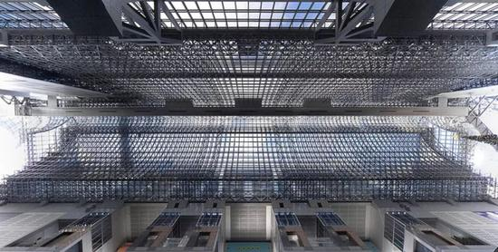 独立的高层建筑,被‘空中花园’连接起来,形成了‘连接式超高层大厦’的新型结构。连接处中间被掏空的原形风洞设计,维系了天地自然的连接。中间两条钢制通道横穿而过。整体刚性的结构中,原广司又加入了山丘、溪水等自然点缀。大厦采用的正面玻璃倒影天空,整座花园如同被放置在天空中。