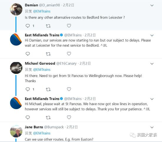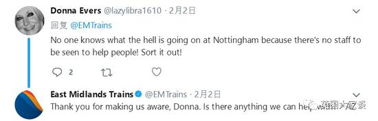 沿线的车站里,等啊等啊等不到车的乘客都开始去东米德兰列车公司(East Midlands Trains)官方推特下开启求助&吐槽模式: