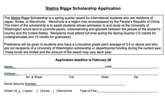 “斯塔提拉·比格斯奖学金是春季学期提供给日本、韩国和满洲居民的奖学金。满洲现在是一个被中华人民共和国所包含(encompassed)的地区。