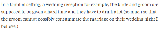在很多家族聚会场合,比如说婚礼,新郎新娘要喝很多酒,多到我觉得新郎晚上根本就没办法完成他的新婚之夜……