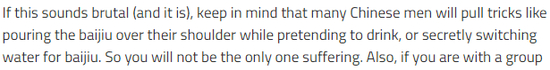请一定记住:中国人可能会把白酒倒在肩膀上,或者偷偷往里面兑水,所以你可能是唯一真的在喝酒的人……