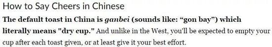 对歪果仁而言,在中国酒桌上听到最多的两句话大概就是:“干杯”以及“你干杯我随意”。所以,几乎所有介绍中国酒桌文化的帖子里,都会贴心地科普怎么说这两句话以及它们的涵义。