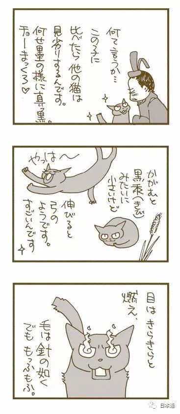 “骊猫一只,是太宰府次官献给先帝的宝物。其他猫毛色皆为浅黑,独此猫色黑如墨,啊啊,犹似韩卢。盘卧如黑黍,伸展如弓,伏卧团圆不见尾,宛若洞中玄璧,走路不闻其声,恰似云上黑龙,夜间捕鼠之凶猛,更胜他猫。”