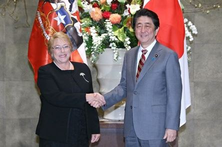 下午5点59分,安倍在官邸欢迎来访的智利总统巴切莱特,两人共同检阅仪仗队。