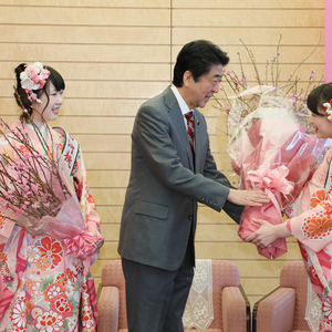 下午,安倍会见了茨城县桃花“形象代言人”神原彩瑛等人,并获赠一束刚开放的桃花。安倍怀抱桃花称,看到花,他的心也变得开朗了。