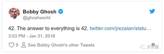 还有人根据Douglas Adams的科幻小说《银河系漫游指南》里讲到42是“对生命,宇宙和万物终极问题的回答”,来回答这道题