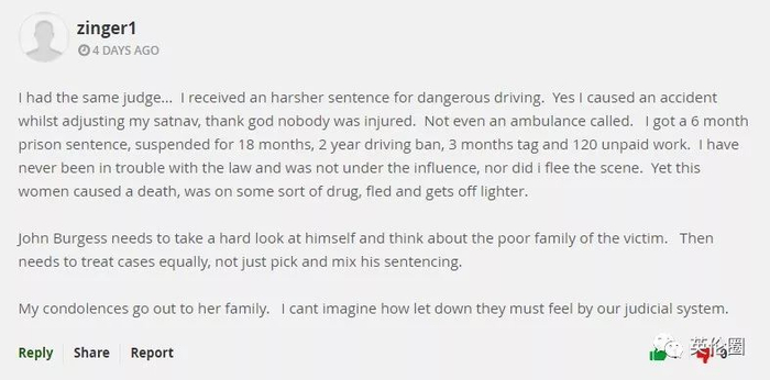我被同一个法官判决过……当时只因为危险驾驶就获得了更严重的判决,对,我在设置卫星导航的时候出了车祸,谢天谢地没有任何人受伤,连救护车都不用叫。我被判6个月监禁,缓刑18个月执行,2年禁止驾驶,佩戴3个月跟踪器,以及120小时无报酬工作。然而这个女司机害死了一个人,吸食了毒品,却判得更轻。