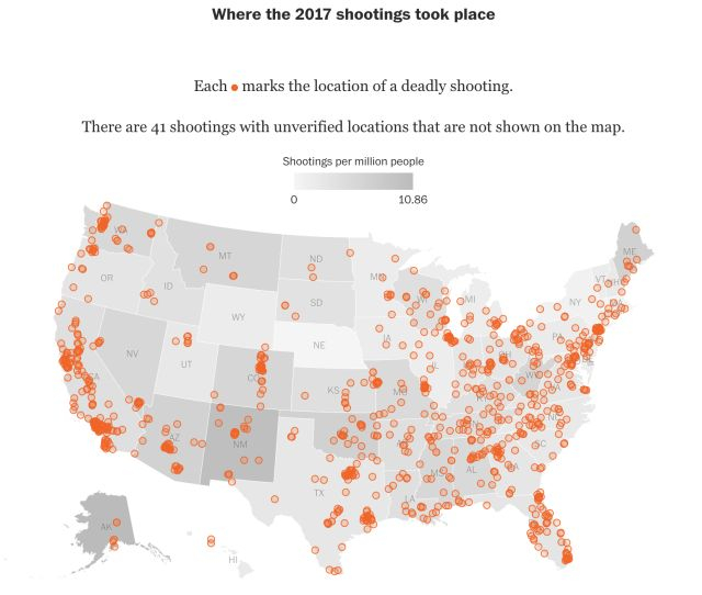 而数据在公司内的使用除了业务之外也对新闻报道的方式产生了影响。2014年,在调查美国枪击案件时,邮报记者Wesley Lowery发现美国并没有相关的专业数据库。因此,他决定自己建立一个。自这个项目从2014年开始以来,先后总共有超过70名邮报记者参与。通过简洁的视觉设计和直白的数据呈现方式,读者能够快速、有效地获得相关信息。至今,邮报已经连续4年自发统计全国枪击案件情况。2016年,这一系列报道获得了普利策奖的全国报道奖项。