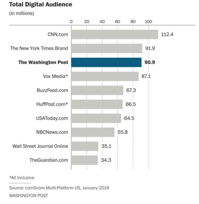 而美国数据分析公司ComScore 2017年的数据显示,过去两年里,邮报每月网页流量增长了56%,达到七千八百万次访问。年度总浏览量达到八亿两千万次。来访用户达到八千百万,在线订阅读量也比2016年增加了22%,达到一百万,超越《今日美国》成为全国第三,仅次于《纽约时报》和《华尔街日报》。2017年中,邮报的科技团队达到250人。而根据2018年的最新发布情况来看,《华盛顿邮报》已经持续两年获得了两位数的增长。