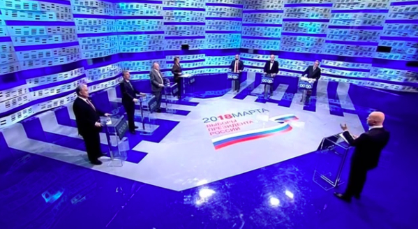 28日早晨8点,俄罗斯主要电视台《第一频道》 播出辩论实况。参加的总统候选人有:巴布林(全民联盟党候选人)、格鲁季宁(俄共候选人)、日里诺夫斯基(自由民主党候选人)、索布恰克(公民倡议党候选人)、苏莱金(共产党人党负责人)、增长党候选人季托夫的代表Solovei 以及亚夫林斯基(亚博卢党候选人)。
