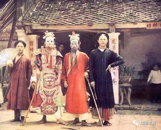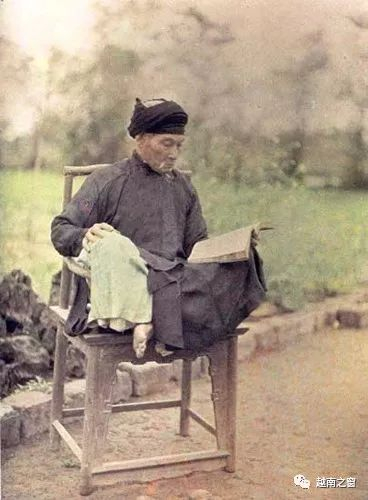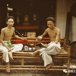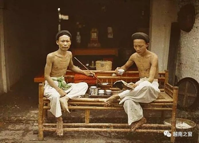 1915年, 两名越南人在河内的一家吸烟商店喝茶,抽烟斗。